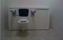 und das WC macht rechts oder links Platz z. B. für einen Rollstuhl, von dem aus man sich auch ohne Hilfe auf die Toilette setzen kann. So wird auch der kleinste Raum behindertengerecht!